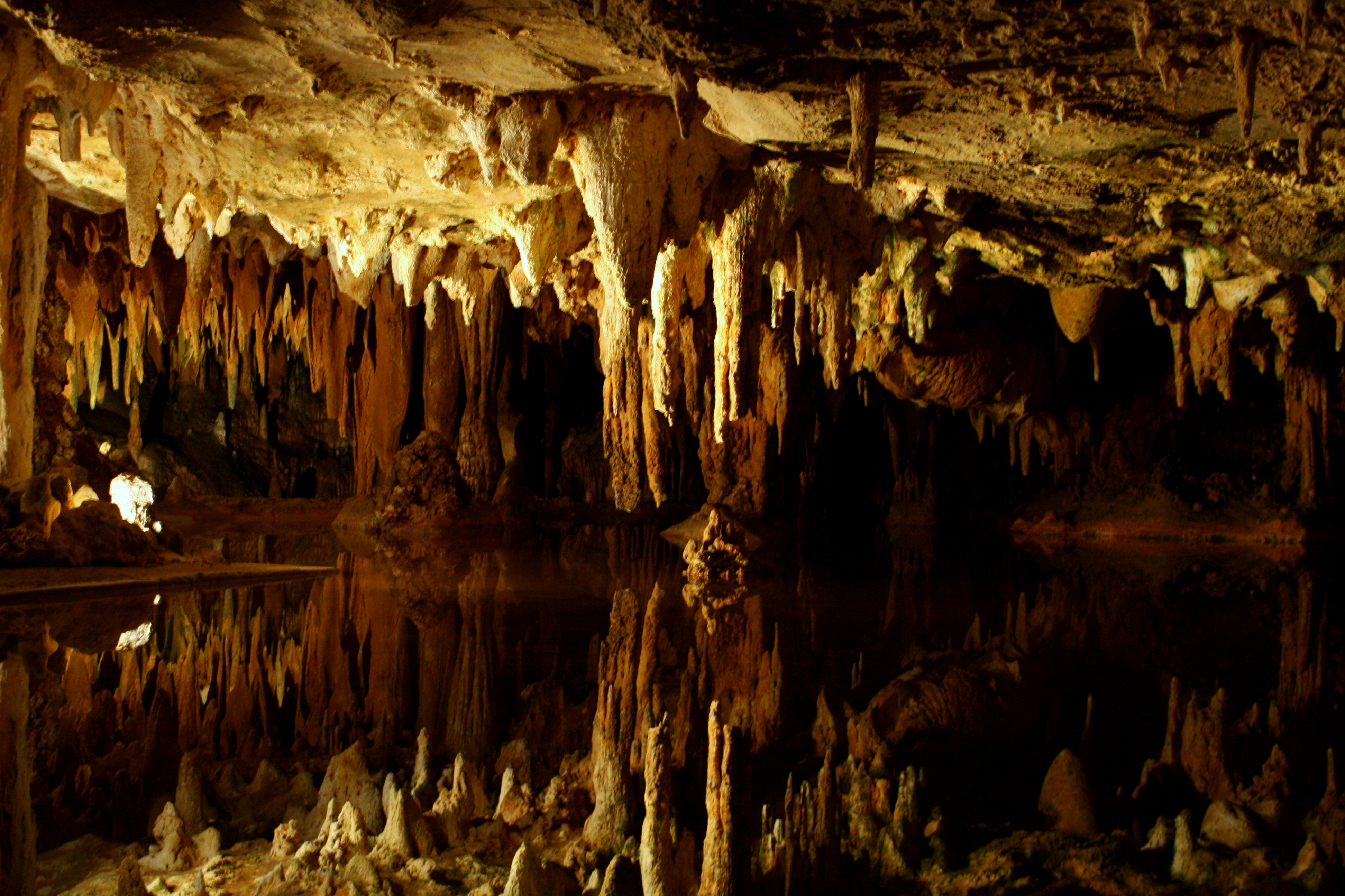 Although I enjoyed the dim, cavernous, immensity of the entire tour, my favorite stop was at Dream Lake. Standing water reflects the ceiling, making the relatively small and shallow “lake” look deep and mysterious. The more you look down into the lake, the deeper it seems.
